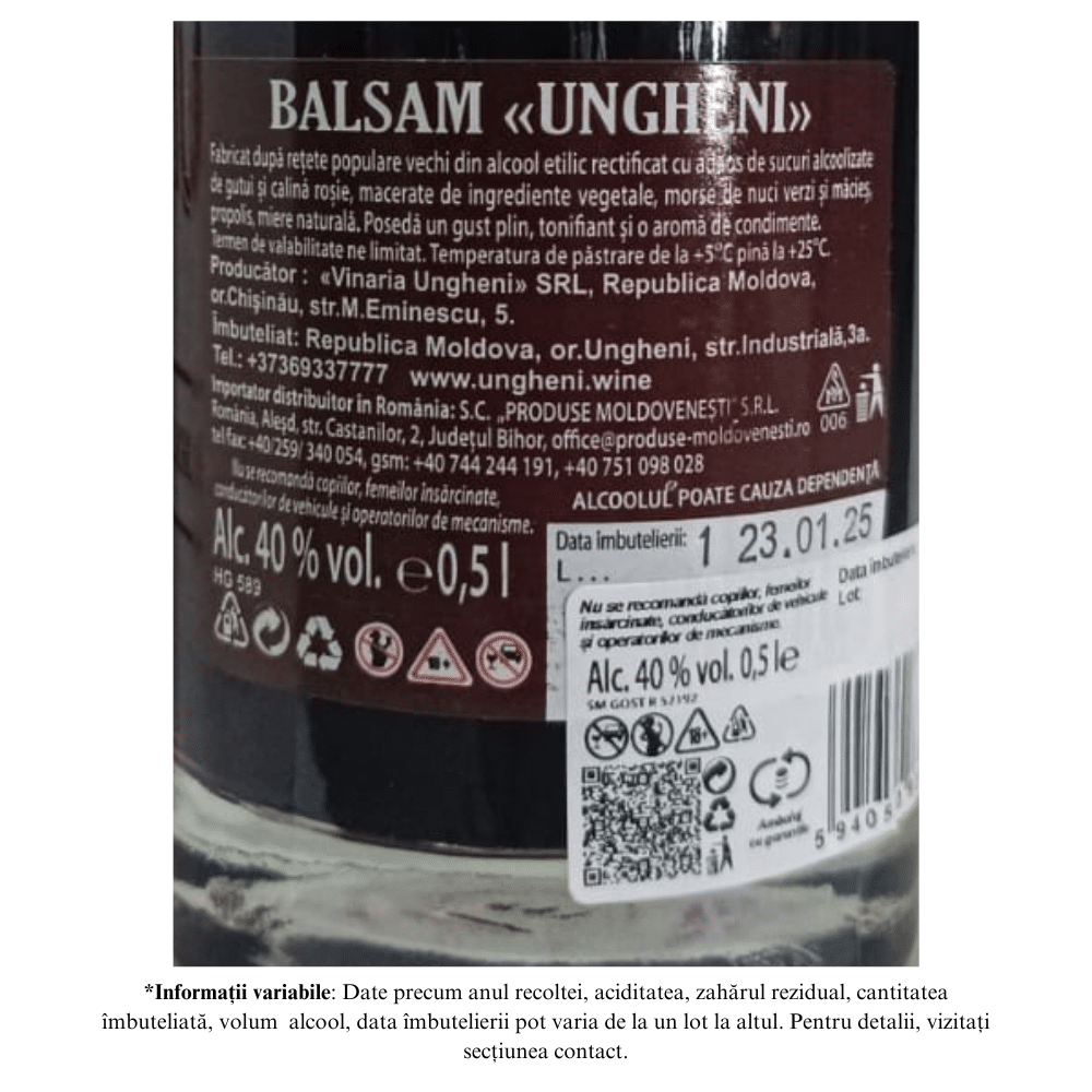 Balsamul este un digestiv produs după rețete popular cu extract natural de plante, produs în Vinăria Ungheni. Are volum de 40% alcool cu adaos de extract obținut din peste 40 de plante medicinale.