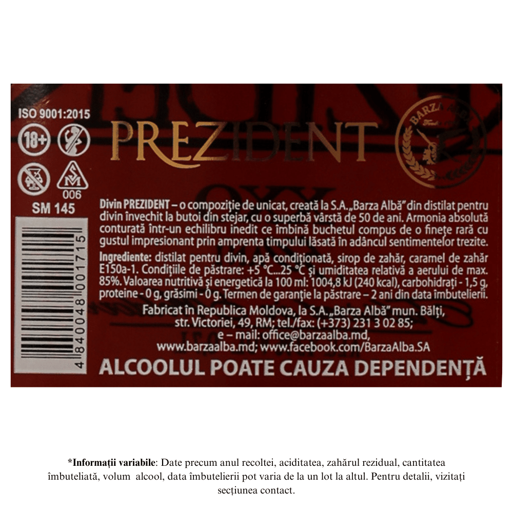 Impunător şi elegant, Prezident Divin XO îşi etalează calitatea extraordinară, buchetul remarcabil şi textura catifelată cu o nonşalanţă fermecătoare, concluzionând cu un finish construit ca la carte. Personalitatea sortimentului se datorează în mare măsură maturării îndelungate în butoaie din lemn de stejar la care au fost supuse distilatele de vin selectate pentru a face parte din cupaj.