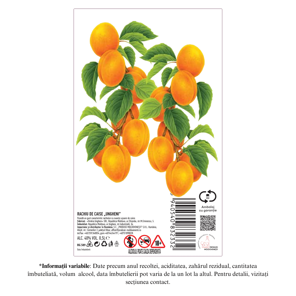 Ungheni Rachiu de Caise este o băutură tradițională rafinată, obținută din cele mai bune caise selectate cu grijă. Cu o concentrație de 40% alcool, acest rachiu se distinge printr-o aromă pronunțată de caise coapte, oferind o experiență senzorială captivantă.