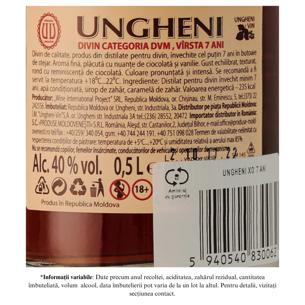 Divin XO este produs la Vinăria Ungheni cu o vechime de 7 ani, fiind maturat în butoaie de stejar. Are o culoare de chihlimbar-închis și o aromă deosebită.