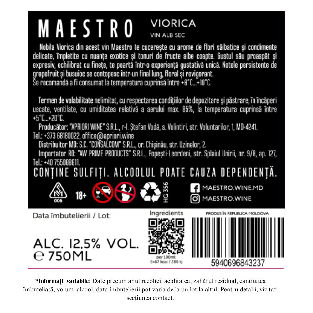 Vin alb sec, Apriori Maestro Virtuoso Viorica, 0.75L