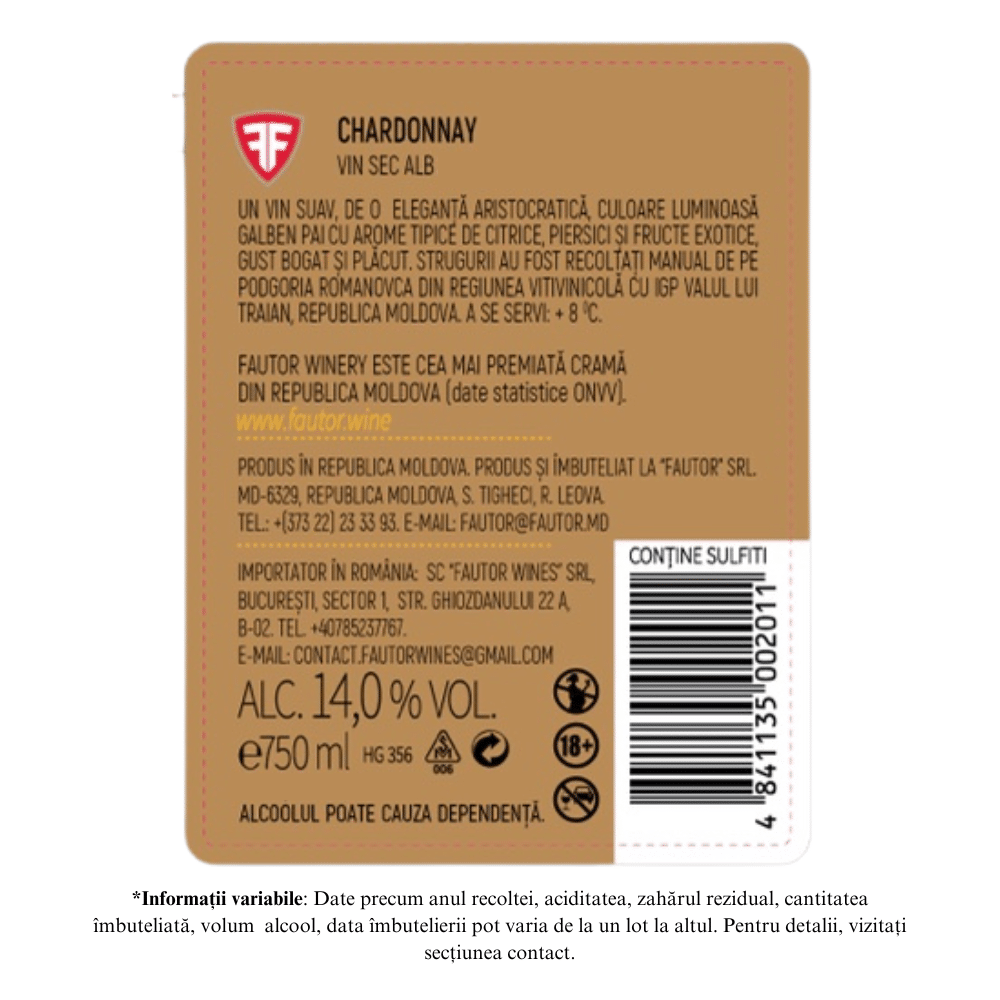 Fautor Aurore Chardonnay este un vin alb sec premium, reprezentand rafinamentul acestui soi international, adaptat cu succes terroir-ului din regiunea Valul lui Traian. Cu un echilibru elegant intre prospetime si complexitate aromatica, acest vin surprinde prin expresivitate si finete.