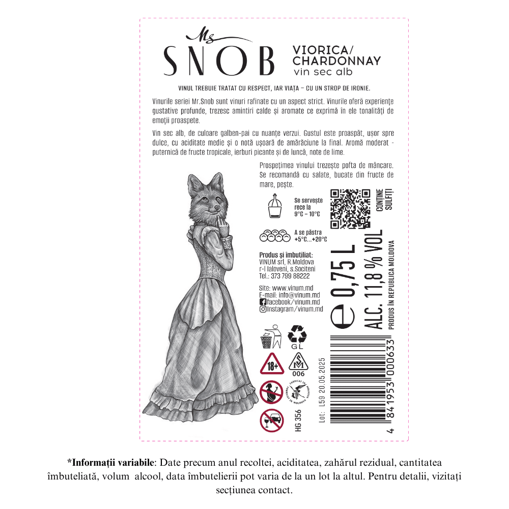 Vin Alb Sec, Mr Snob, Viorica – Chardonnay, Vinum, 0,75L