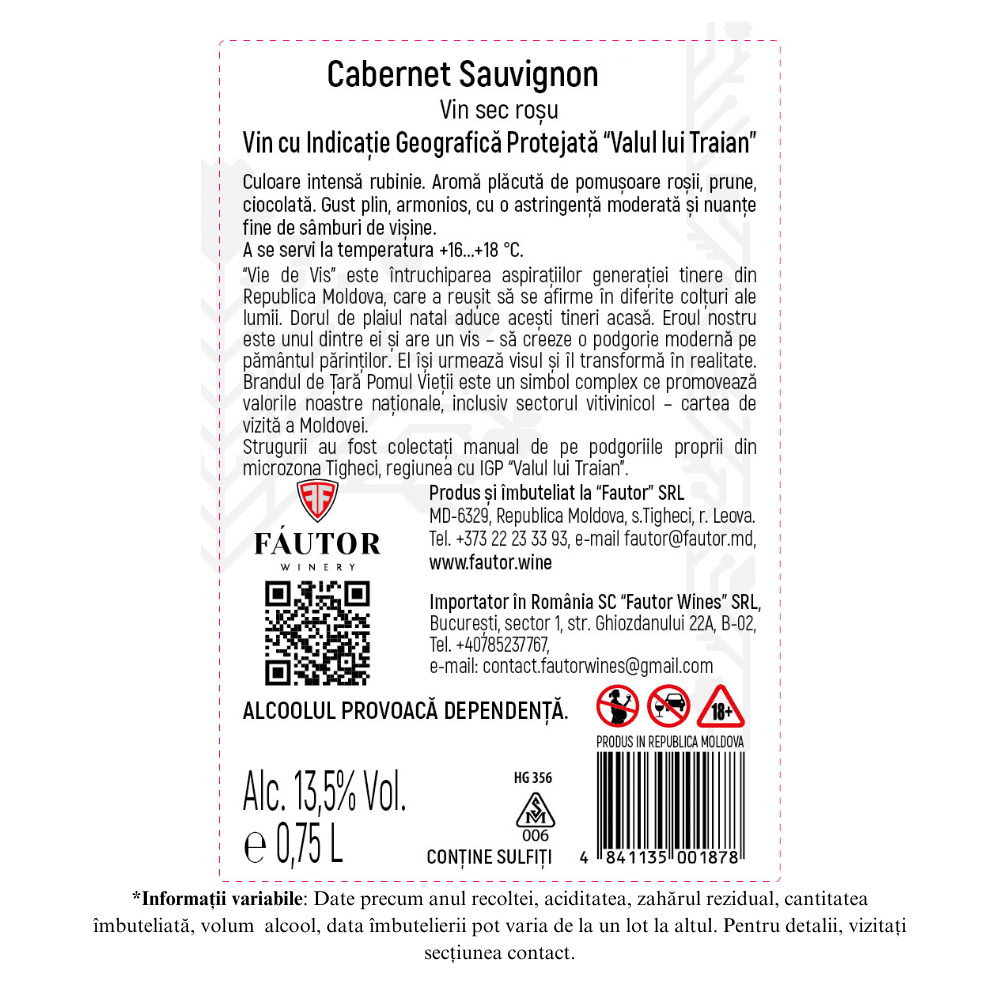 Vinul rosu sec Fautor Vie de Vis, realizat din Cabernet Sauvignon, se remarca prin culoarea intensa rubinie si profilul aromatic complex de pomusoare rosii, prune si ciocolata.