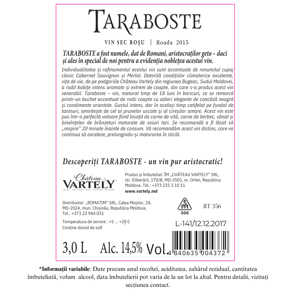 Vin rosu sec. Cabernet-Sauvignon & Merlot Taraboste 2015 este un vin exceptional, produs din struguri intens aromați și extrem de copți, recoltați de pe podgoriile Château Vartely din sudul Moldovei, zona Bugeac, și maturat timp de 18 luni în barrique-uri noi.