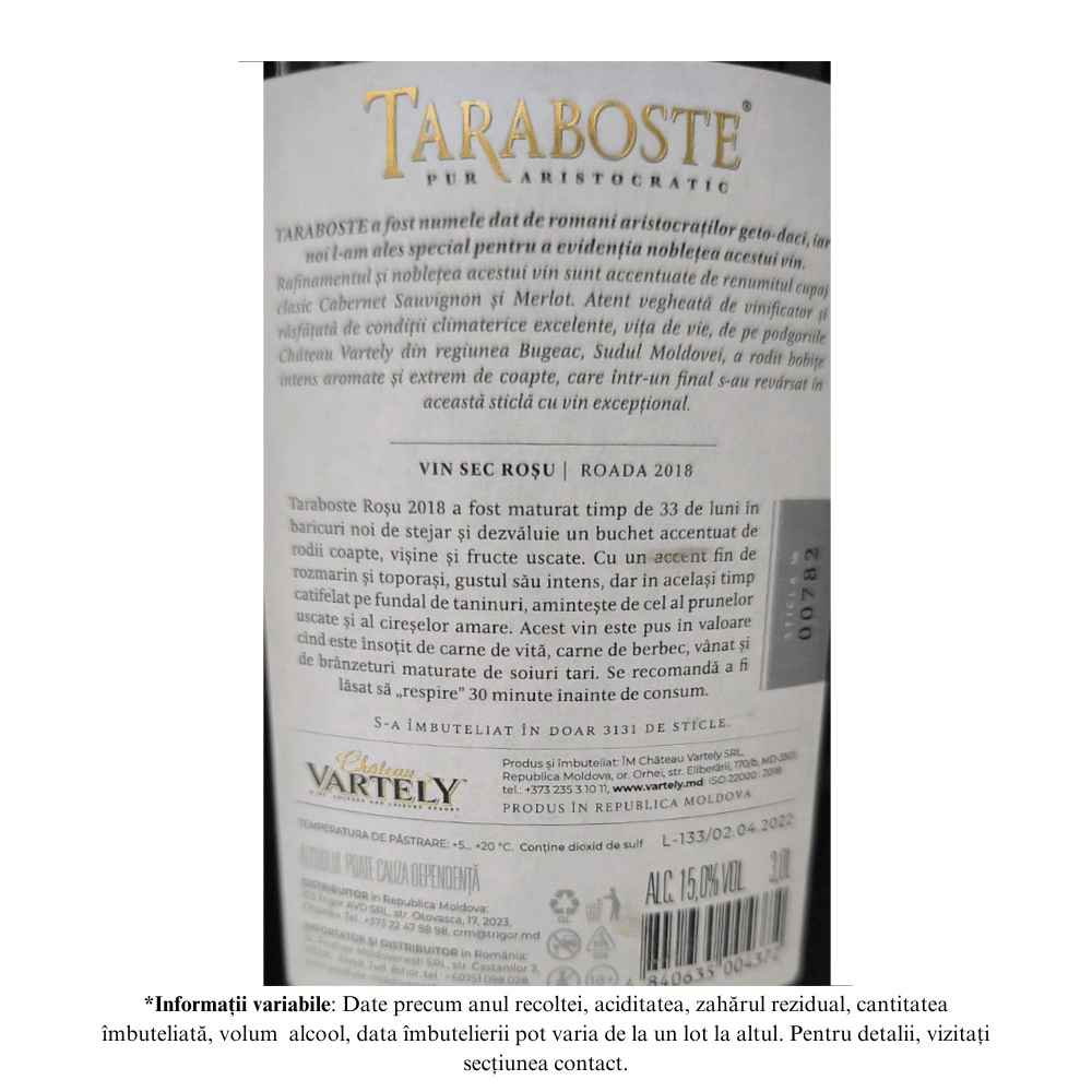 Datorită condițiilor climaterice excelente, vița de vie de pe podgoriile Château Vartely din regiunea Bugeac, Sudul Moldovei, a rodit bobițe intens aromate și extrem de concentrate, din care s-a născut un vin venerabil – Taraboste Roșu.