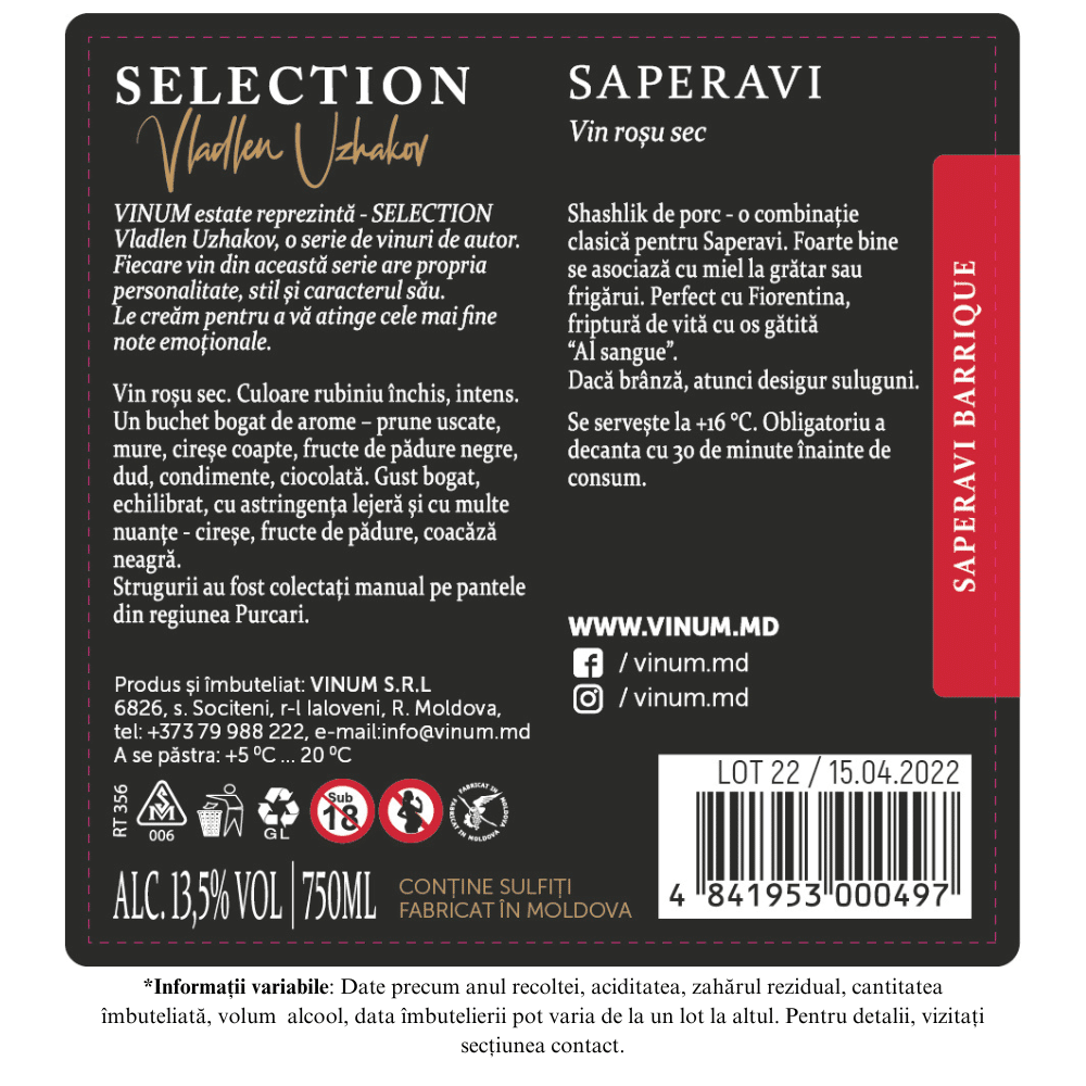 Vin Rosu VINUM estate SELECTION, Saperavi, Sec 0,75L